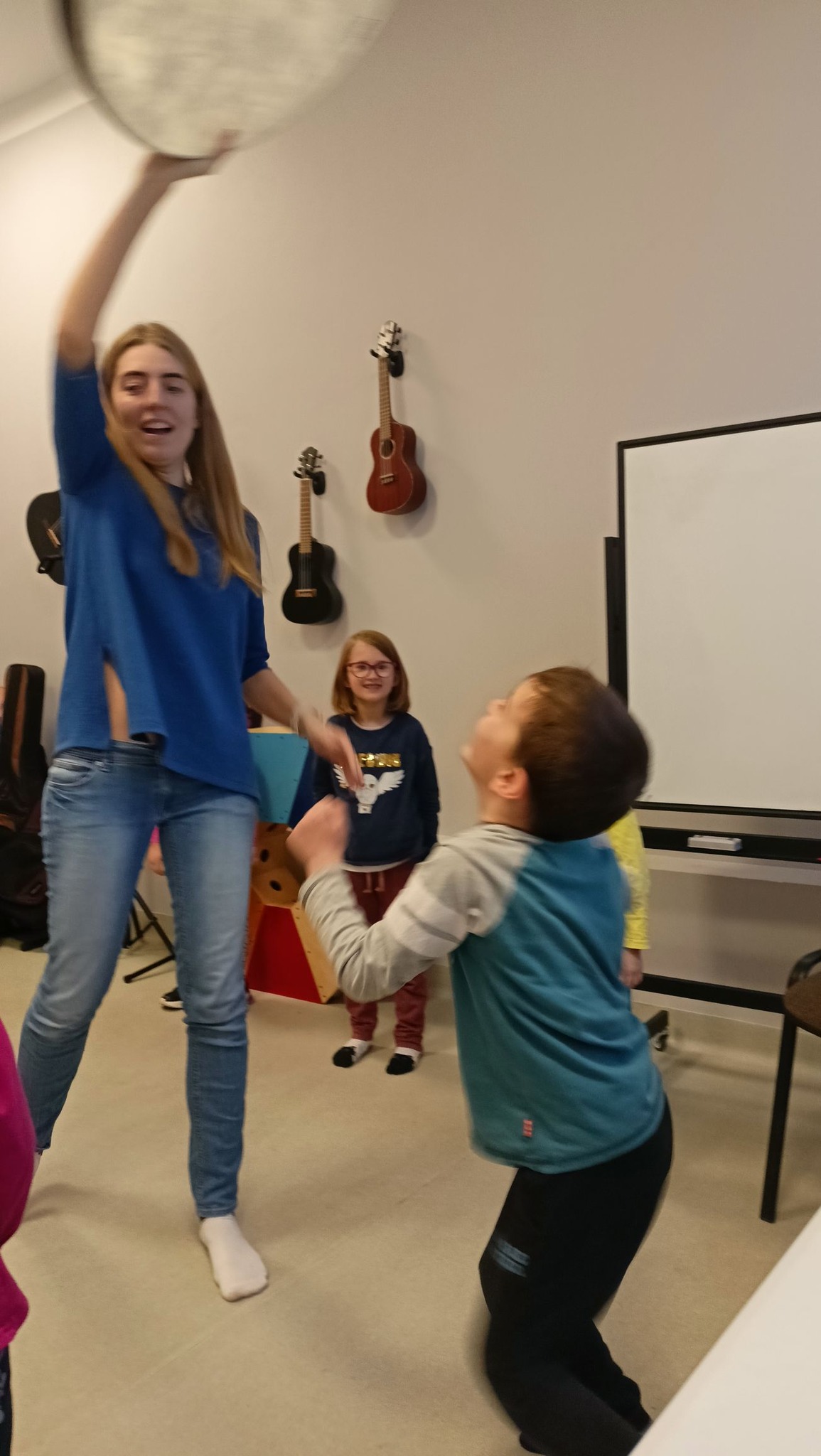 Podczas zajęć maluchy rozwijają swoje umiejętności wokalne i instrumentalne, łącząc śpiew z twórczym akompaniamentem.