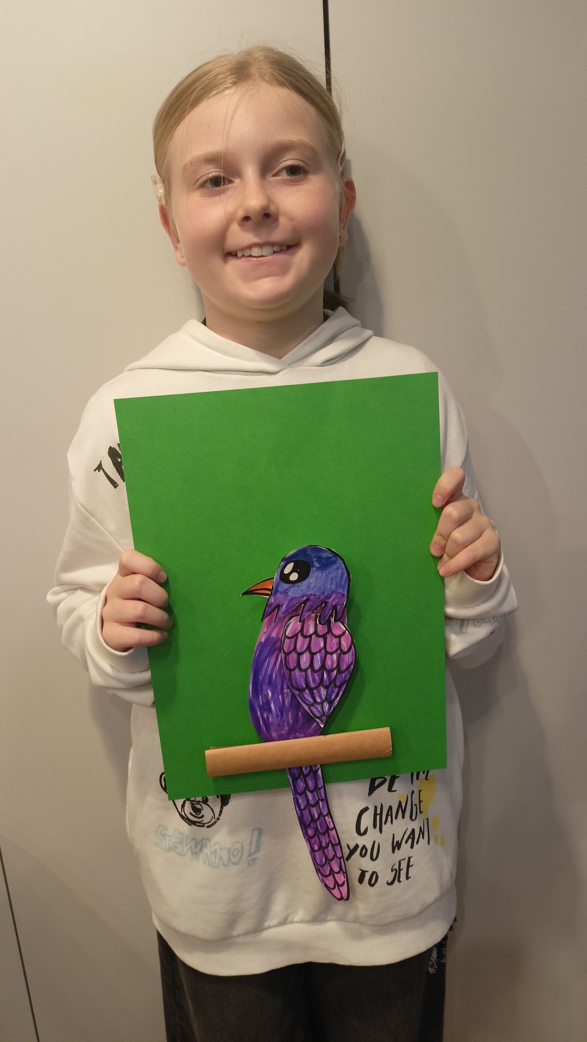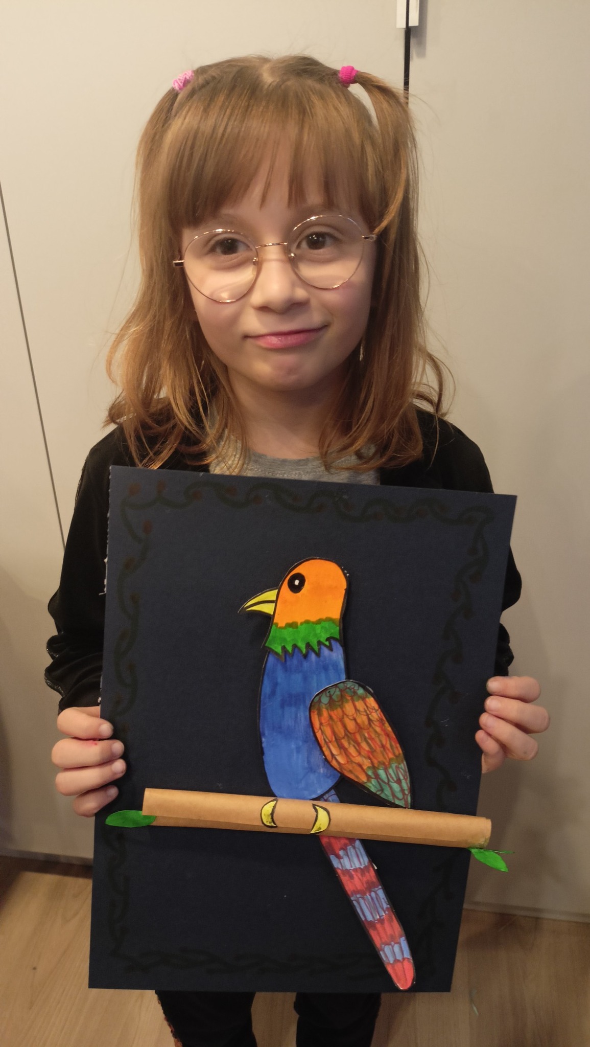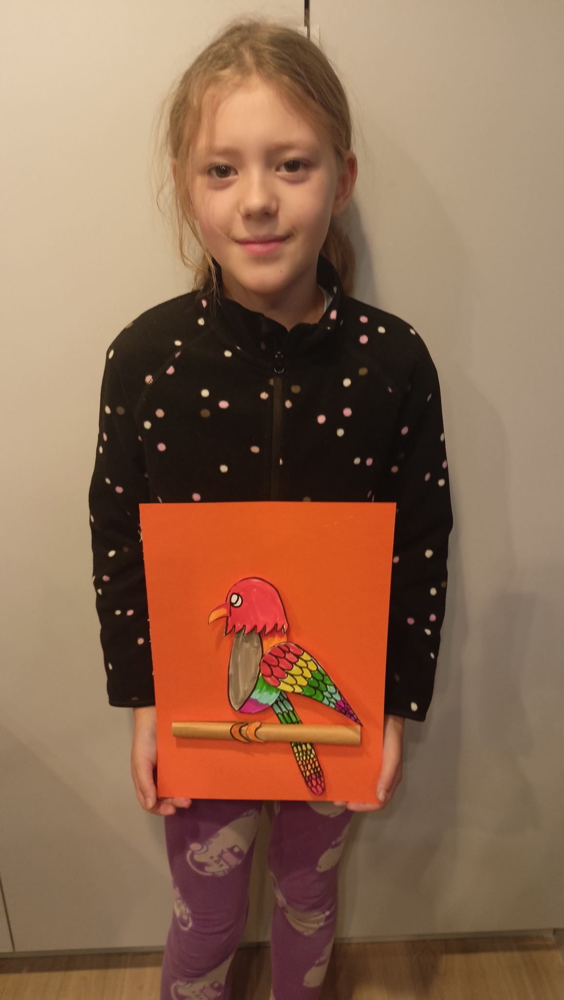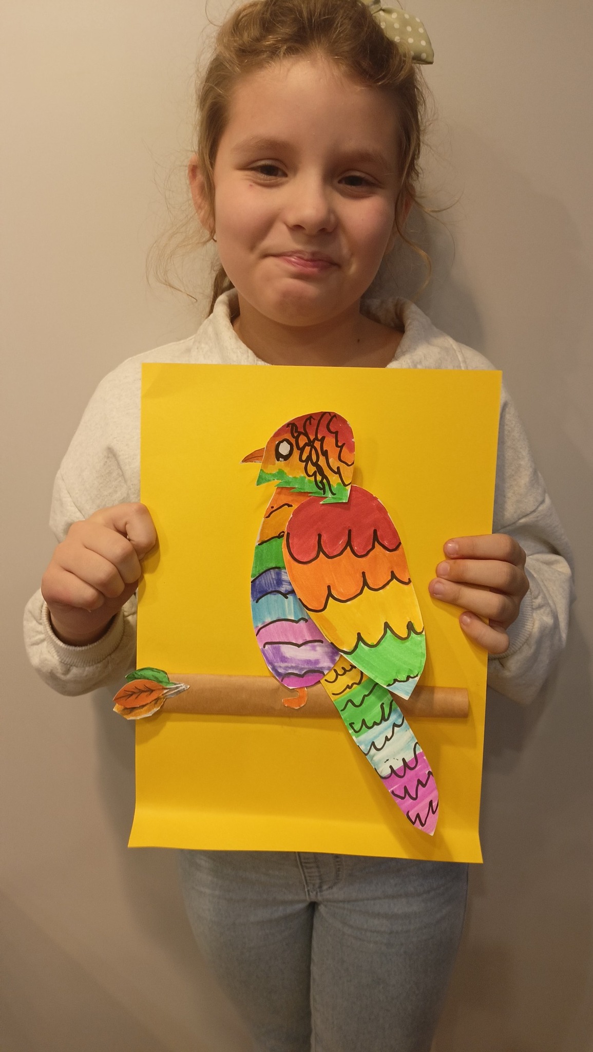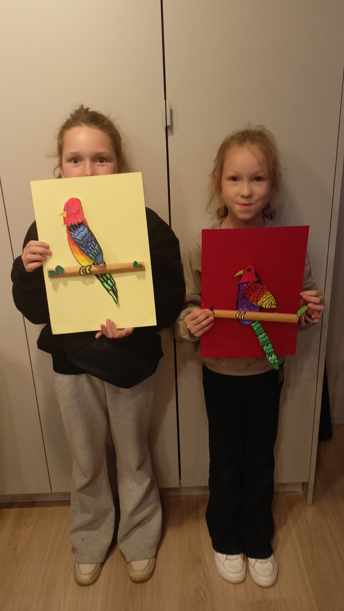 Najpierw dzieci z zapałem rysowały i kolorowały swoje papugi, dobierając odcienie tak żywe, jak w dżungli pełnej słońca. Potem z precyzją i skupieniem wycinały narysowane wcześniej kształty, formowały je i sklejały, nadając im trójwymiarową formę. Z płaskich kartek wyłaniały się barwne ptaki o piórach mieniących się wszystkimi kolorami tęczy.